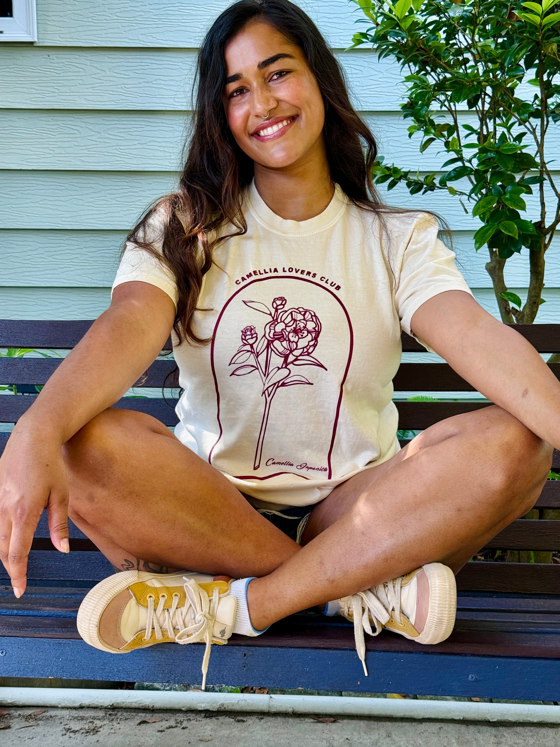 Join the Camellia Lovers Club with this Ivory tee featuring a hand-drawn Camellia flower by artist Lyssa Yates. The vibrant magenta ink and Latin name Camellia Japonica make this tee a must-have for any flower enthusiast.